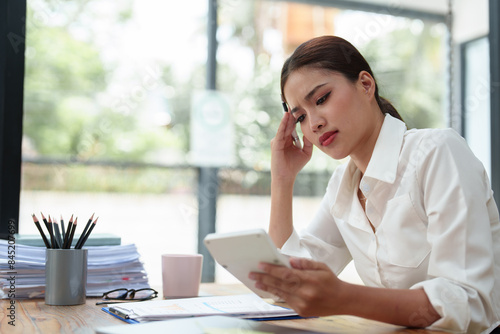 Tired, stressed Asian businesswoman suffering from headaches after using a laptop for a long time, female office worker sitting for a long time Office syndrome concept.