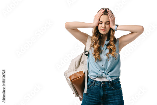 beautiful, person, girl, female, people, caucasian, head, hand, sleepy, woman, indoor, touching, alone, attractive, student, backpack, cephalalgia, exhausted, isolated on white, copy space, closed eyes, studio shot, young adult