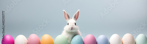 Title: Cute Easter Bunny Pet Rabbit With Easter Eggs, Copy Space For Easter Background, White Bunny Background, Pastel Colors, Easter Celebration, Easter Egg Hunt