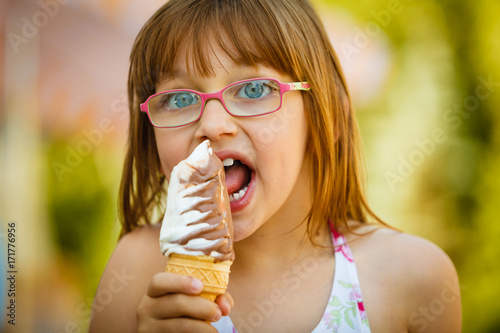 Toddler girl in eyeglasses eating ice cream