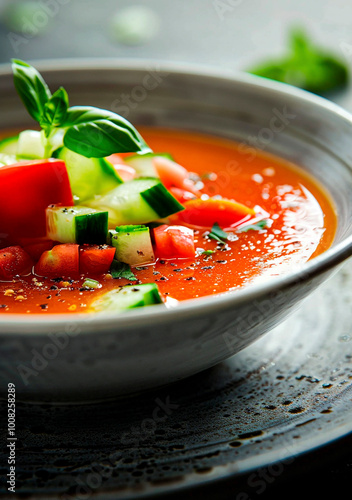 Tomato gazpacho soup with fresh basil, cucumber and tomato in a bowl on black background