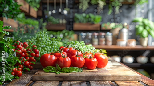 Tomatoes and basil on a wooden table in a rustic kitchen