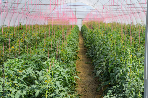 tomatoes, sprout, greenhouse, frame, large, covered, white, cucumber, door, open, ventilation, dirtied, indoor, vegetable, field, row, farm, rural, agricultural, peat, tied, irrigation, watering, rope, weeding, mature, green, stem, turf, dirt, germ bud, object, inside, grass, freshness, leaf, pepper, growth, plant, cultivate, season, indoor, nature, spring, fresh, ground, net