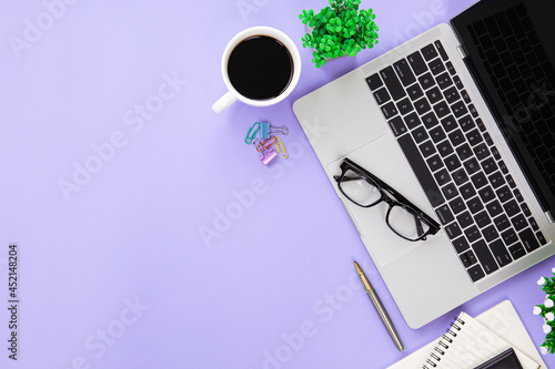 Top view desk or top view table or modern office desk flat lay background with computer laptop and office equipment for work area copy space and education school concepts.