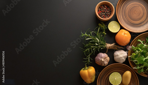 top view herbs, vegetables, with plain black background, with empty copy space,
