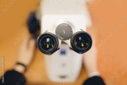 top view microscope. Eyepieces for science with hands.