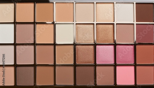 Top view of a close-up flat lay shot of a palette with beige, pink and brown eyeshadows, colored powders, in the cosmetics industry. Perfect for advertising campaigns