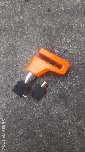 top view of a motorbike safety lock on a road texture background. concept background transport, transportation, secure, motorcycle, Steel, key, safe, vehicle, wheel, bicycle, padlock, equipment, metal
