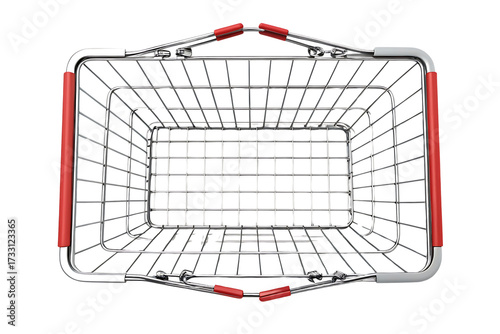 Top view of an empty metal shopping basket with red handle grips on a black background