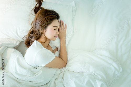 Top view of Beautiful Attractive Asian woman sleep and sweet dream on bed in bedroom in the morning,Healthcare Concept