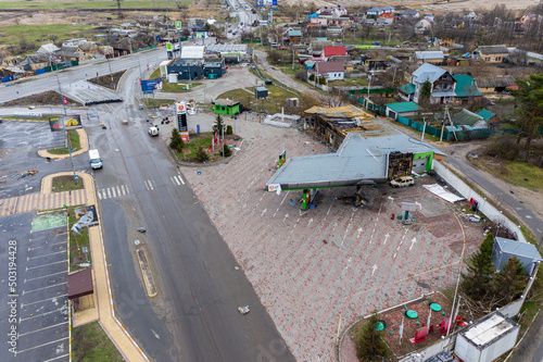 Top view of gas stations and other buildings destroyed by rocket attacks by Russian troops.