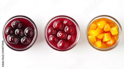 Top view of sour cherry compote and mixed fruit kompot on a white background, refreshing homemade beverage2