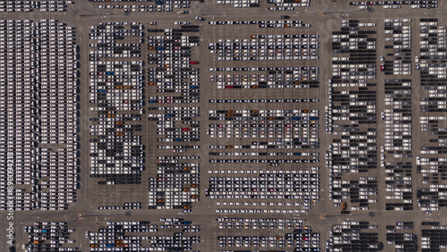 Top view of the electric vehicle transport yard and intercontinental shipping industry..
