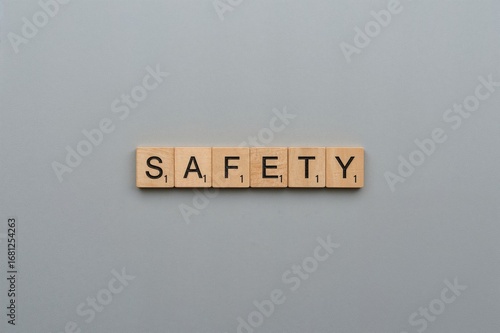 Top view of wooden blocks spelling SAFETY on a grey surface for design concept