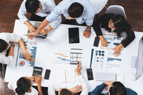 Top view project manager communicate and collaborate with team using project management software, tracking progress of project task and making schedule plan at meeting table. Prudent