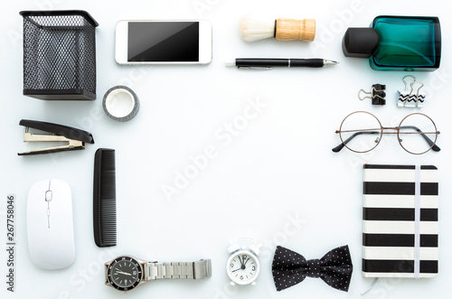 Top view white desk with men's accessories and office tools. Copy space in the middle for father's day greeting text. Black and white colors