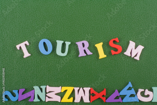TOURISM word on green background composed from colorful abc alphabet block wooden letters, copy space for ad text. Learning english concept.