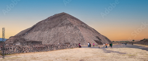 Tourists visit the ruins of the ancient pre-Aztec city of Teotihuacán in Mexico. Perspective view with the Pyramid of the Sun against the clear sky at sunset.