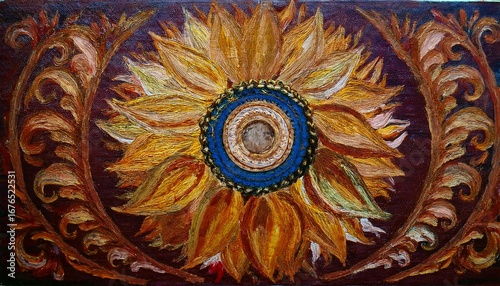 oil painting, sunflower, sun, flower, plant, nature, brown, illustration, three-dimensional, mysteriousness, divinely, gate, light, sheen, glowing, warm colors, hot, energetic, flames, burning, art, abstract, texture, brushstroke, eddy, majestic, beauty, life, summer, hope, healing, interior, decoration, model, conception, mandala, colours, circle, wallpaper, fractal, homogeneous, ornament, floral, orange