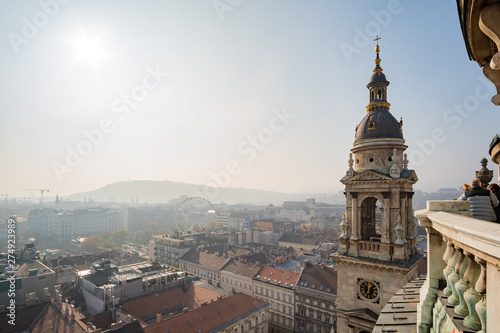 Tower of the St. Stephen's Basilica and aerial cityscape