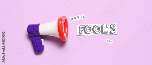 Toy megaphone and text APRIL FOOL'S DAY on color background
