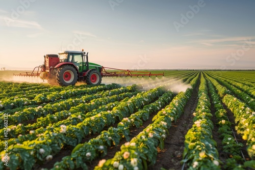 tractor, field, crop, green, sunset, spraying, agriculture, farming, rural, gold, sky, landscape, nature, sprayed, sunrise, dusk, dawn, machinery, farm, harvest, countryside, dirtied, plant, growth, fertilizer, pesticide, irrigation, productivity, efficiency, generating, season, sun, cloud, horizon, ground, wide, row, bright, orange