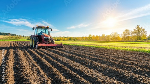 tractor, farmland, agriculture, dirtied, farming, landscape, machinery, crop, rural, nature, sunlight, outdoors, cultivation, industry, equipment, field, season, environment, harvest, growth, earth, technology, tilling, green, grass, horizon, sunrise, sky, scenery, planting, engineering, productivity, plowing, day, summer, rural area, mechanical, journey, natural, environmental, tillage