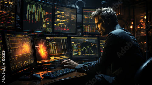Trader focusing on charts with a reflection, in the style of yombe art, bokeh, sharp and edgy compositions