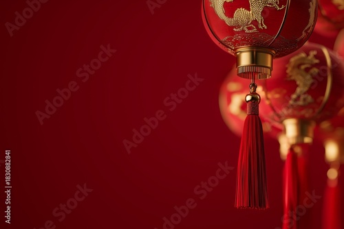 Traditional Chinese Red Lantern with Golden Dragon Design and Tassel on Red Background.