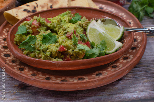 Traditional chunky guacamole with corn tortillas in traditional mexican clay dishes