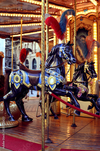 Traditional classic French styled vintage colorful horse carousel in the town square