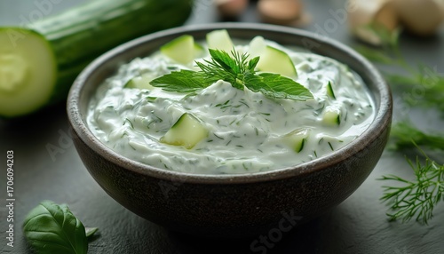 Traditional Greek Sauce Made From Yogurt, Cucumber, And Dill - Tzatziki. Classic Dip Perfect For Gyros, Pitas, Mezes, And Souvlaki. Smooth And Refreshing.
