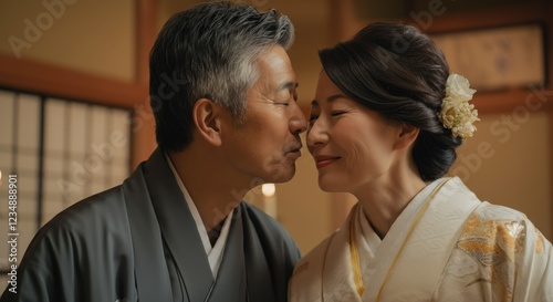japanese, anniversary, celebration, mature, asian, couple, traditional, attire, kimono, elegance, romance, cultural, heritage, intimate, moment, serene, setting, grace, lover, affection, togetherness, kiss, closeness, room, interior, floral, smile, happiness, bonding, connection, tenderness, harmony, portrait, elderly, environment, peaceful, beauty, decor, nostalgia, human relationships, heartfelt, ceremony, style, scene, festivity, timeless, union