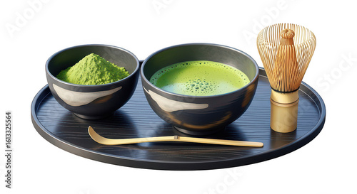 Traditional japanese matcha tea ceremony preparation with whisk and two bowls of green tea powder and prepared drink isolated on transparent background