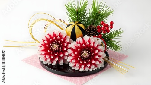 japan, flower, pine, holiday, ball, red, white, arrangement, ritual, seasonal, festive, tradition, oriental, lucky, spirit, branch, design, art, creative, sophisticated, colourful, vibrant, peaceful, serene, calm, leaf, green, gold, ribbon, bow, black, pink, paper, simplicity, elegance, charme, attractive, visual, interest, still, life, object, composition, artistic, expression, joy, happiness