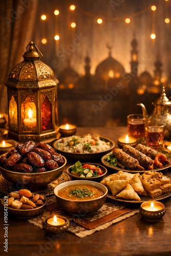 Traditional Ramadan Iftar Table with Lanterns and Festive Islamic Ambience