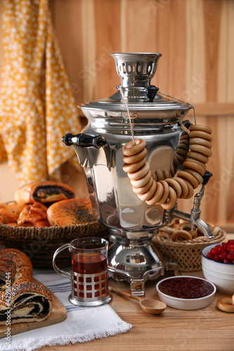 Traditional Russian samovar and treats on wooden table
