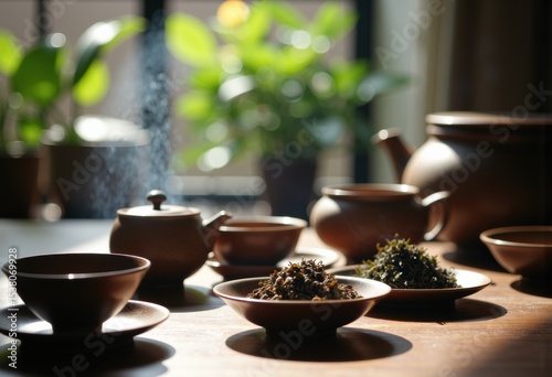 tea, ceremony, teapot, leaf, setup, traditional, loose, sunlight, relaxation, atmosphere, pot, cup, herbal, green, black, oolong, brewing, culture, beverage, nature, plant, kitchen, wooden, tableware, porcelain, infusion, aroma, steam, warm, cosy, ritual, serving, life events, artisan, craftsmanship, organic, natural, health, wellness, enjoyment, favor, rich