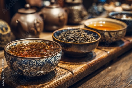 Traditional tea display with herbal blends in handcrafted bowls at a tea house during a tranquil afternoon