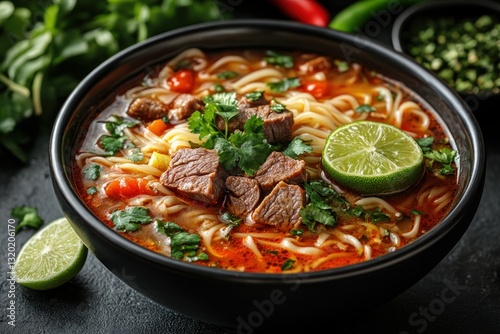 Traditional Vietnamese Beef Noodle Soup Pho Bo with Herbs and Lime