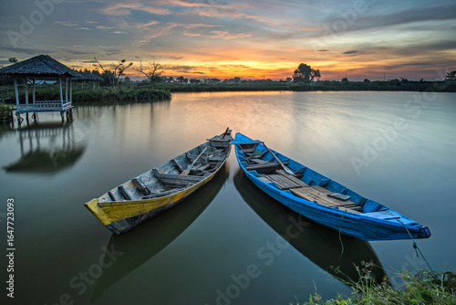 Traditional wooden Fishing boats on a lake at sunrise, Tanjung Burung, Tangerang, Banten, Indonesia