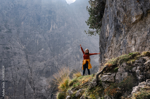 Trail to Sorapis. Dolomite Alps. Italy. Travel girl poses & spreads arms on alpine path over a cliff surrounded by rocks and greenery on background of high rock mountain wall