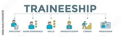 Traineeship banner web icon illustration of job training program with applicant, work experience, skills, internship, career, and profession icons.