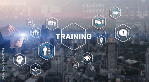 Trainning concept. Businessman pressing on touch screen interface inscription