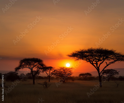 tramonto nella savana con alberi in silhouette e il sole che tramonta all'orizzonte
