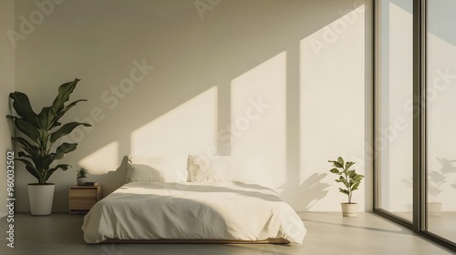 Tranquil and Bright Minimalist Bedroom Retreat with Floor to Ceiling Window Crisp White Linens and a Soothing Indoor Plant for a Calming Zen Inspired Atmosphere