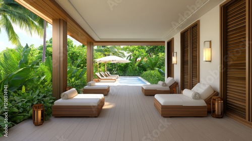 tranquil beachside resort spa featuring outdoor lounge chairs, lush greenery, and serene pool area. inviting atmosphere promotes relaxation and rejuvenation