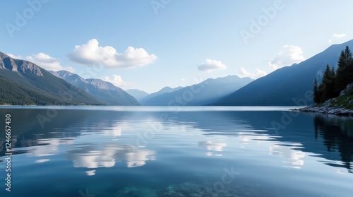 Tranquil Lake Reflects Mountains and Clouds Under Clear Blue Sky