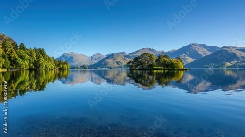 Tranquil Lake Scene with Mountains and Reflections under Clear Sky