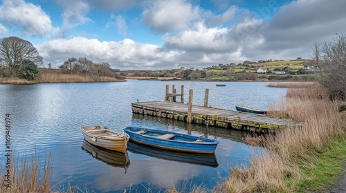 Tranquil Lakeside Scene with Boats Docked at a Wooden Pier